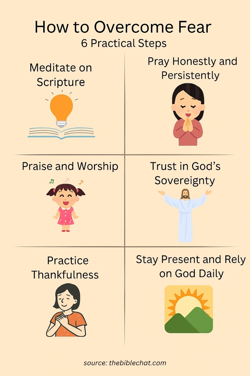 Prayer is a central biblical tool for overcoming fear. Bring your anxieties to God in prayer, expressing your worries and asking for His peace and strength. Praying through Scripture, such as Psalm 23, and asking God directly for courage and comfort are powerful practices.