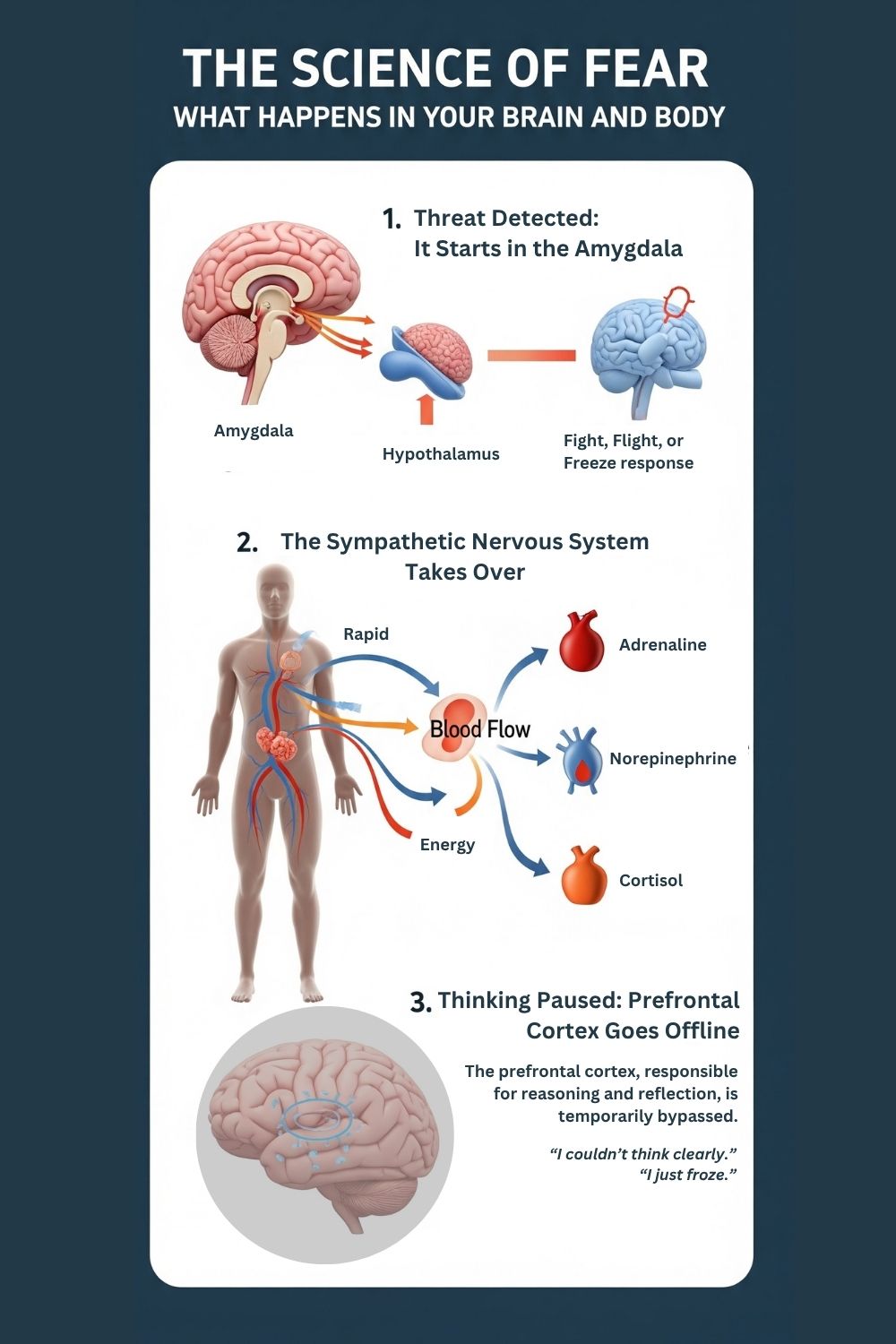 From a neuroscientific and psychiatric perspective - check out the infographic below - fear begins in the amygdala, a part of the brain's limbic system responsible for detecting threats. When activated, it sends signals to the hypothalamus, which in turn triggers the sympathetic nervous system, initiating the fight, flight, or freeze response.