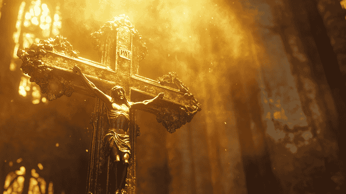 A modern crucifix in a church (image generated with Midjourney)