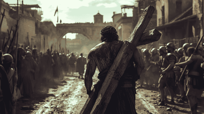 Jesus walking with the cross on Via Dolorosa (image generated with Midjourney)